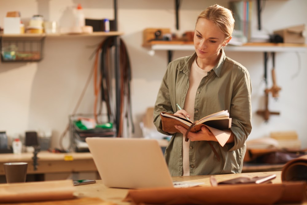 Ung kvinne sitter komfortabelt ved et hjemmekontorbord omgitt av grønne planter og jobber på en laptop mens hun holder en smarttelefon. Hun smiler mens hun ser på telefonen, med briller og en notatbok ved siden av seg på bordet.