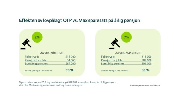 Eksempelet over fra Storebrand tar utgangspunkt i en ung person som skal jobbe til sammen i 40 år. Utregningen legger til grunn utbetaling av pensjon i 20 år. Beløpene er inflasjonsjusterte, og baserer seg på avkastningssatser som er bransjestandard. Eksemplet viser at ved å øke sparingen til 7 % av lønn, vil den ansatte gå fra en halvering av inntekten til et pensjonsnivå som i stor grad muliggjør opprettholdelse av dagens livsstil som pensjonist. De fleste vil ha noe reduserte utgifter når man er pensjonist, slik at et nivå på 80 % - 90 % av inntekten regnes som et akseptabelt nivå.